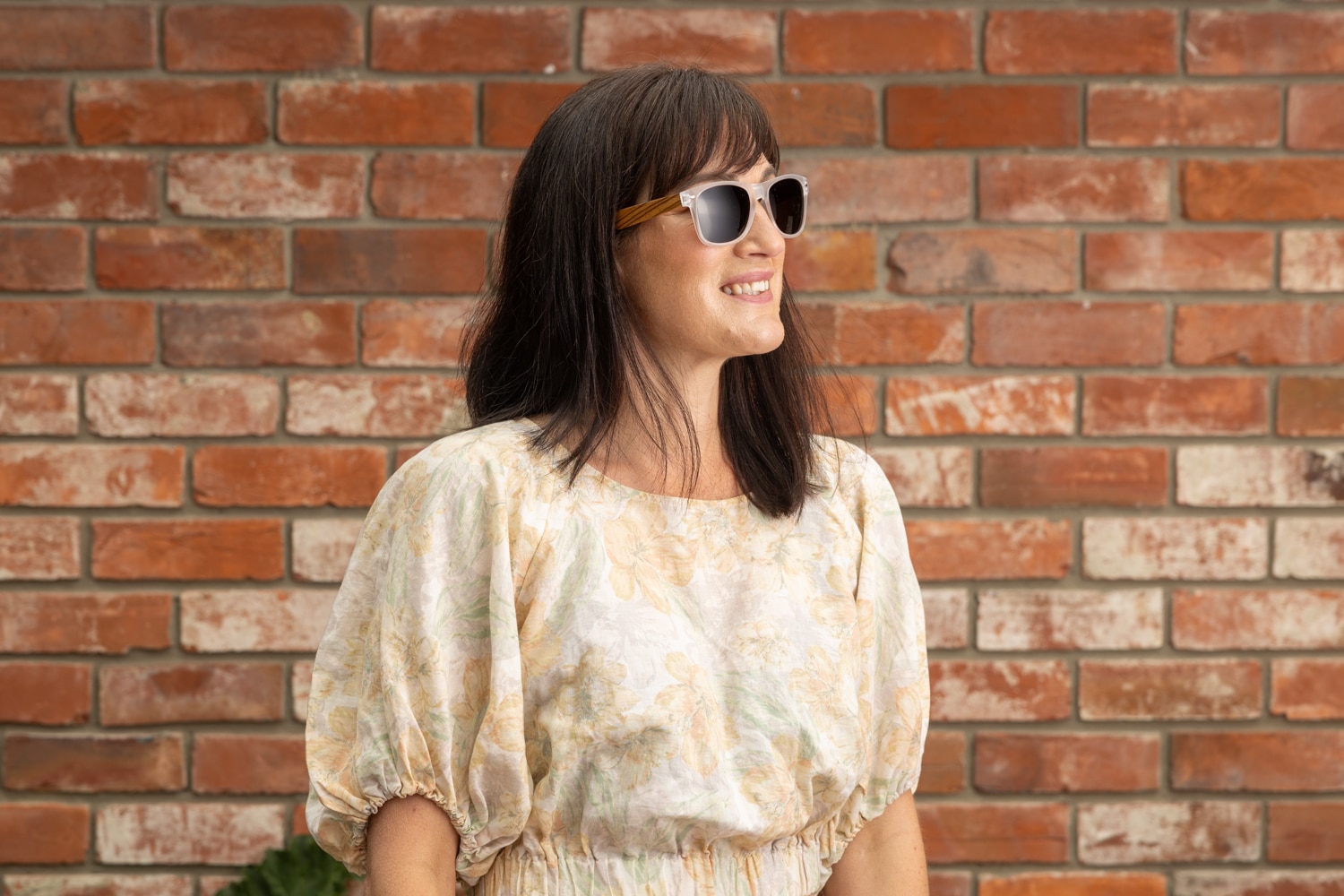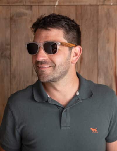 - Clear transparent frame with brown polarised lens and bamboo wood arms