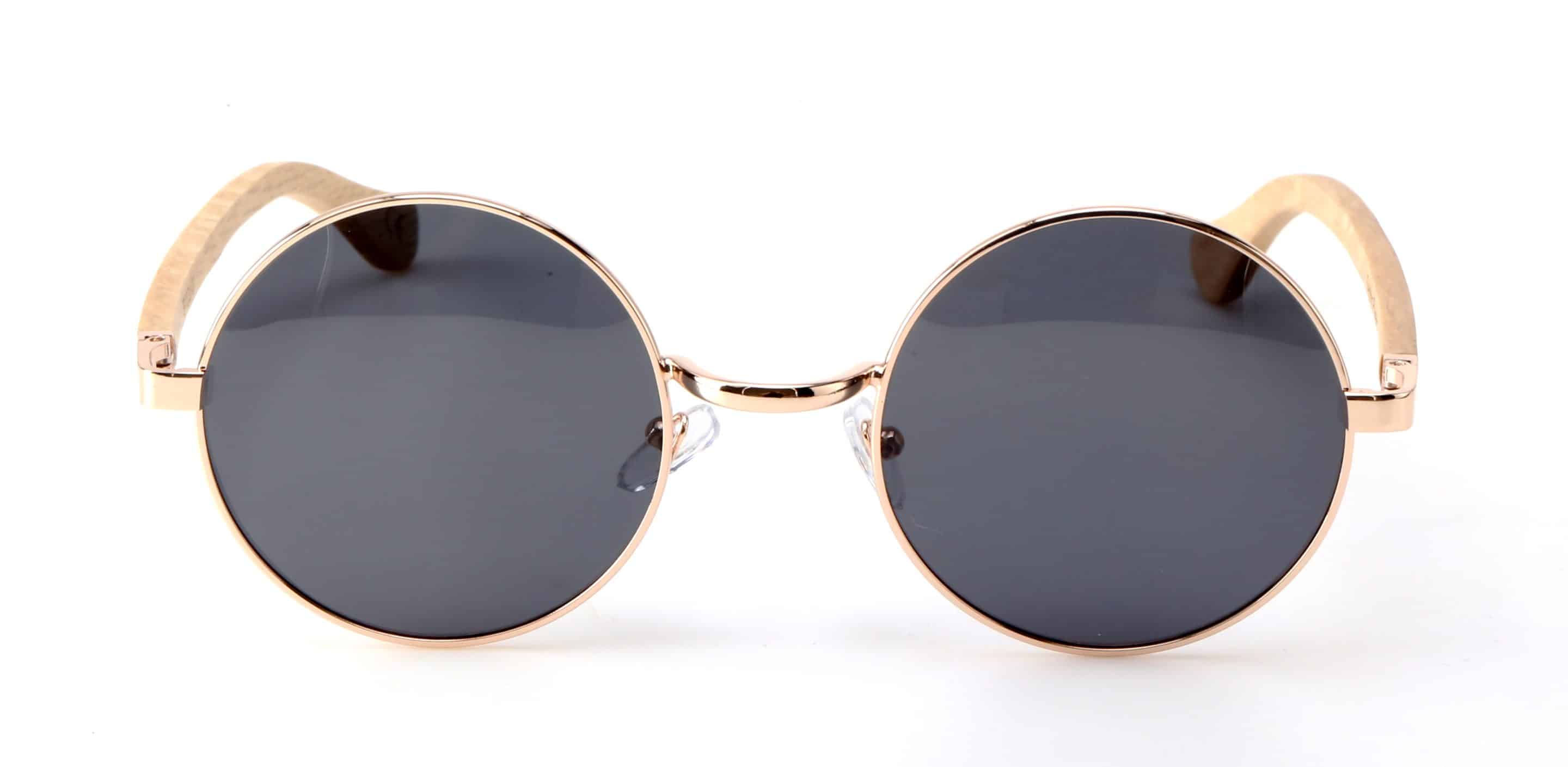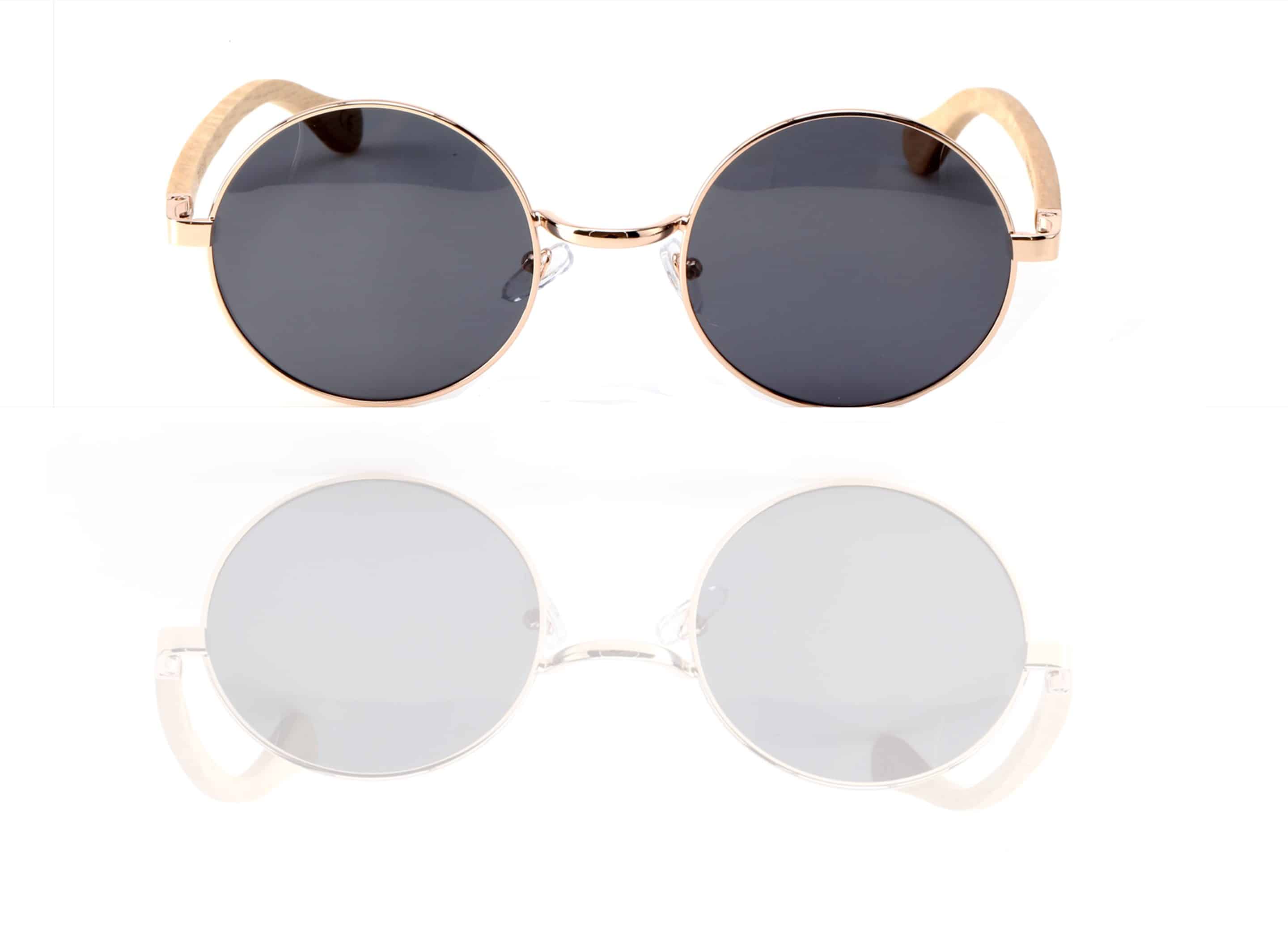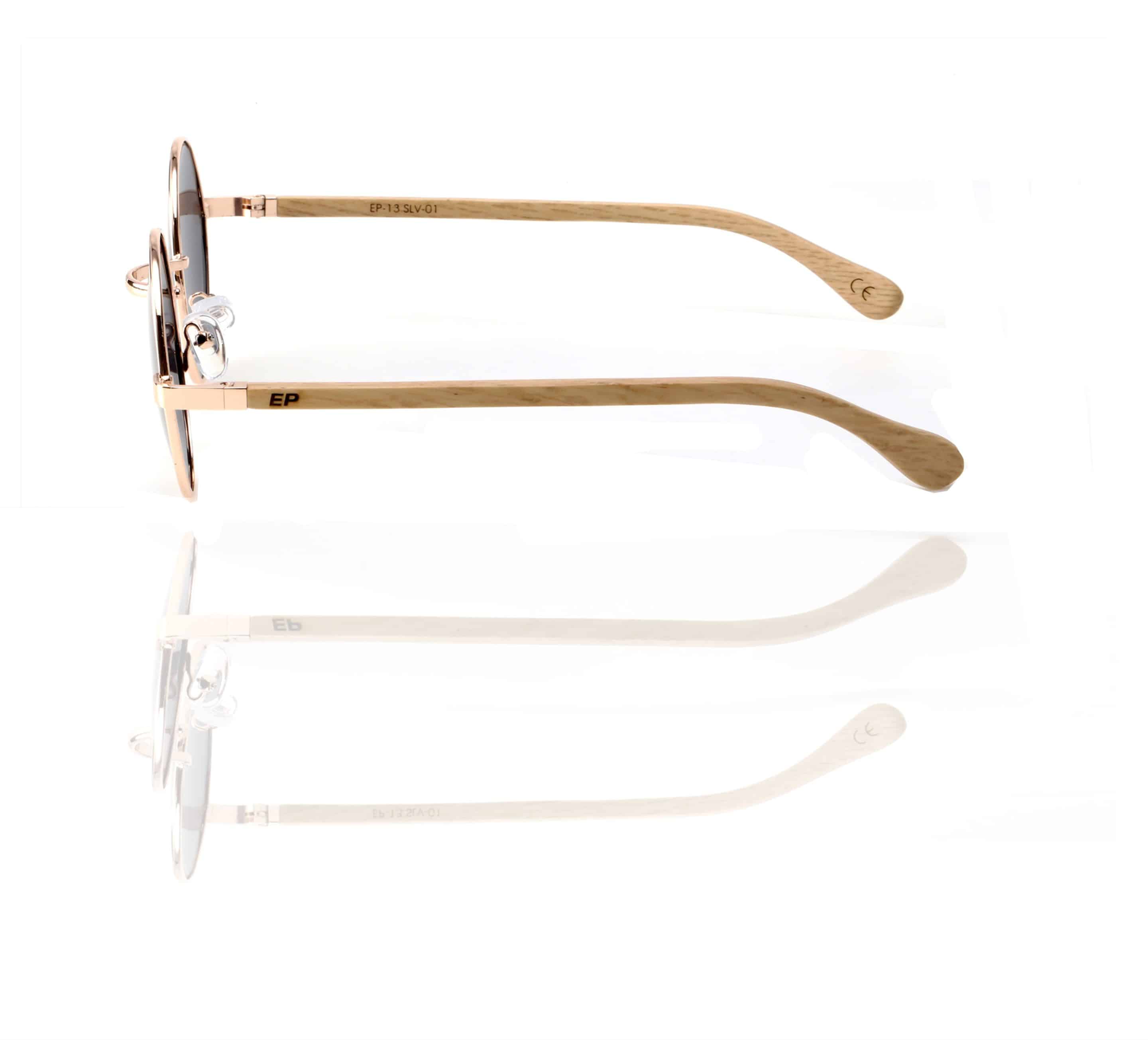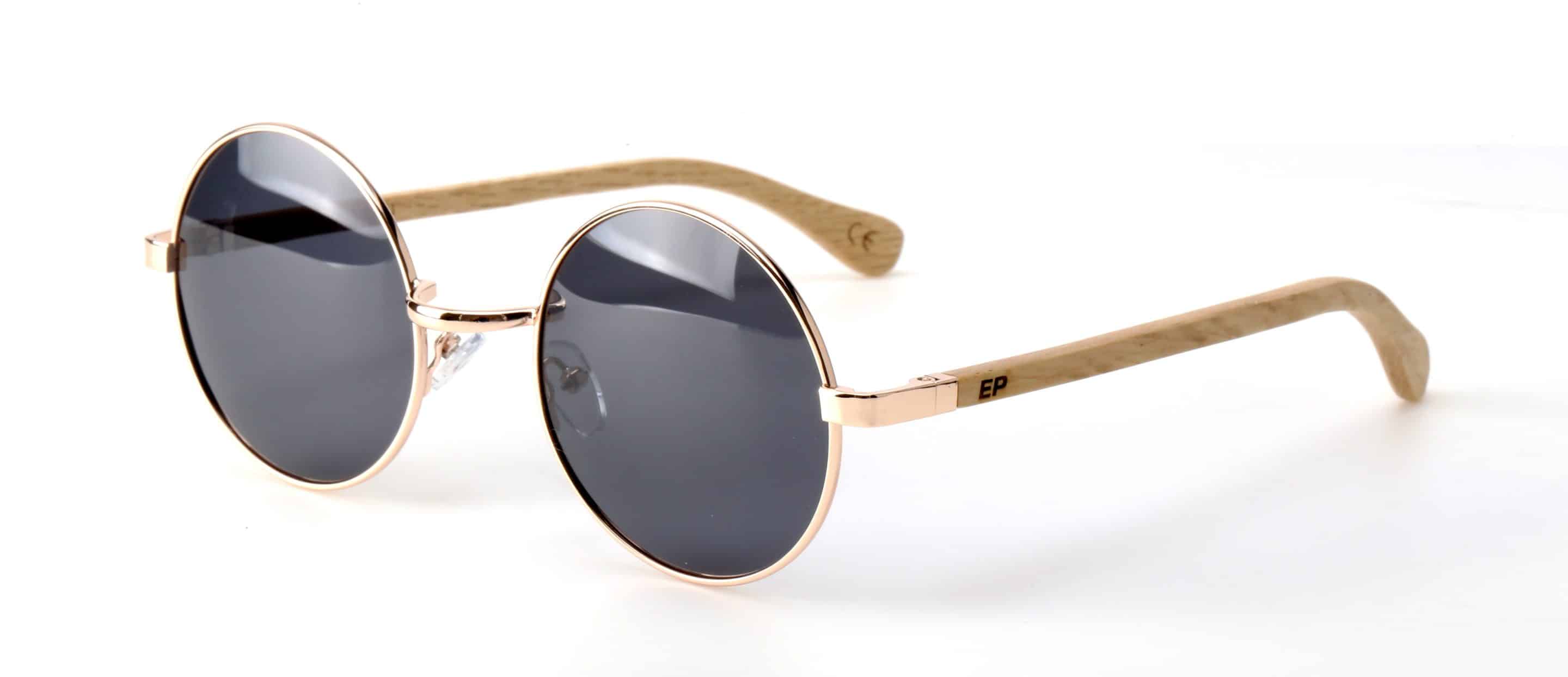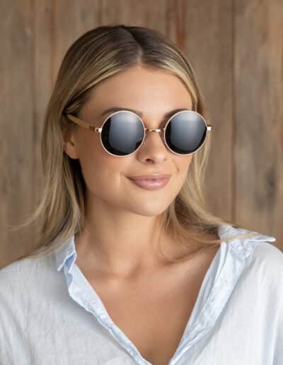 • 70s vibe rose gold round frame with grey polarised lens and Birch wood arms