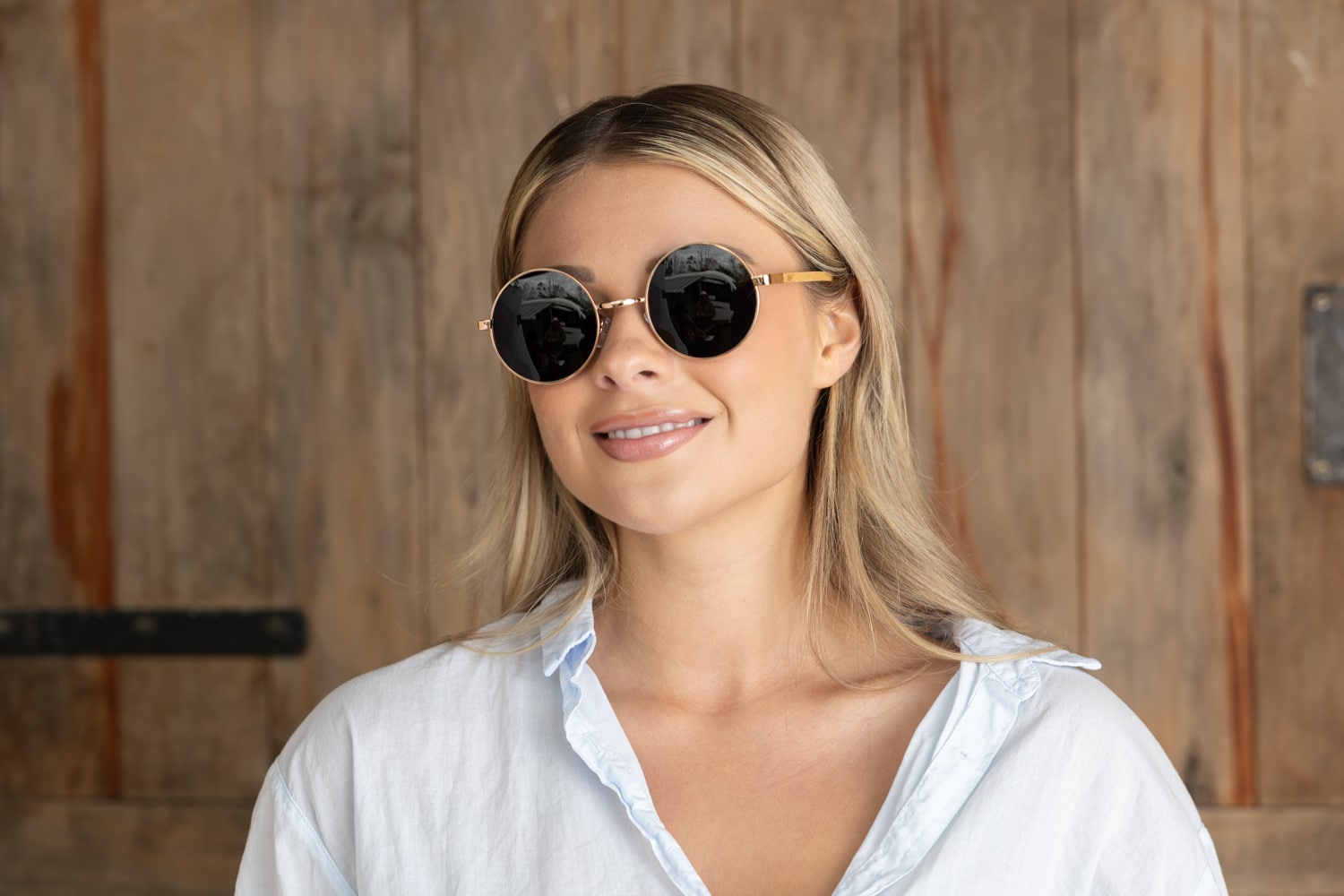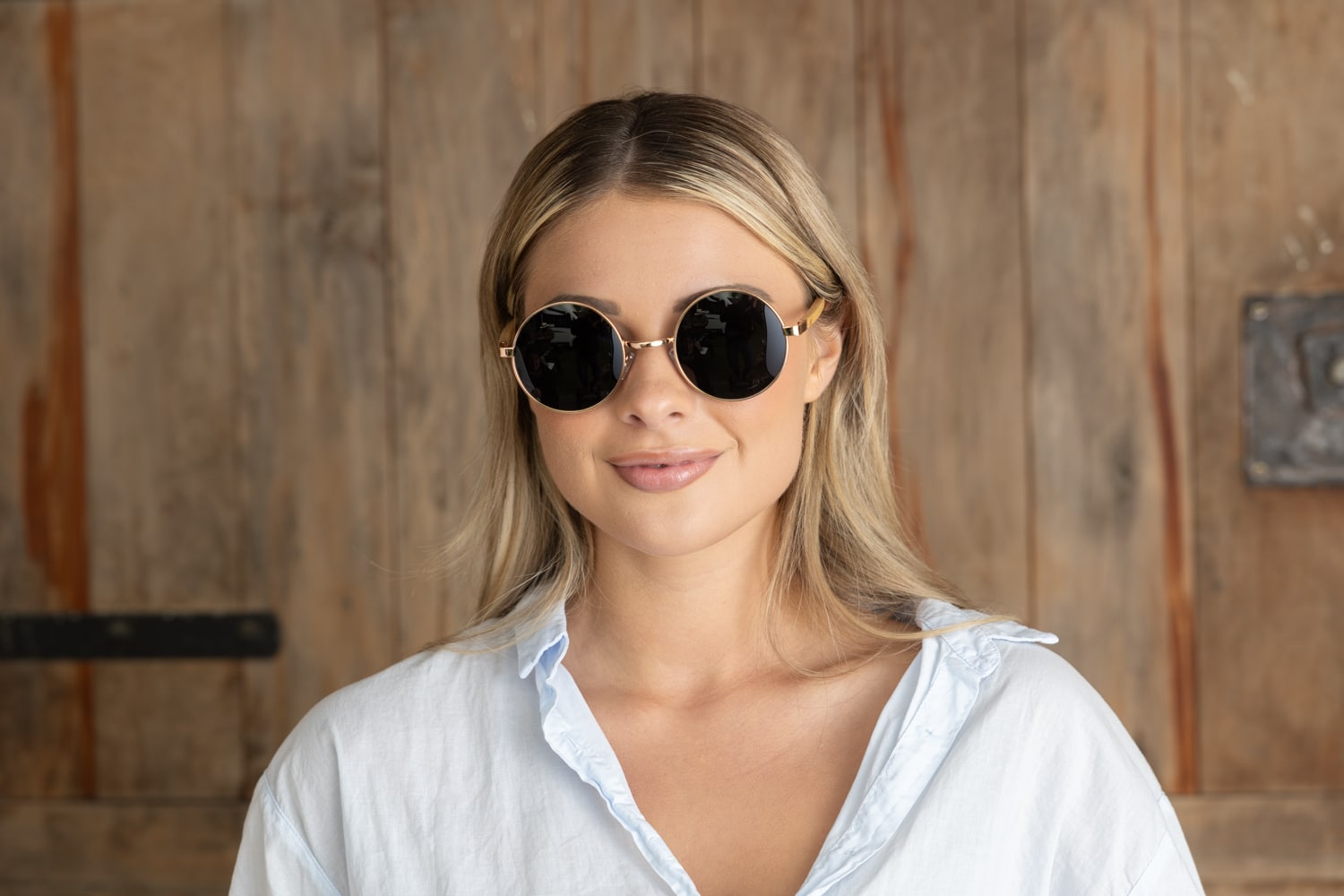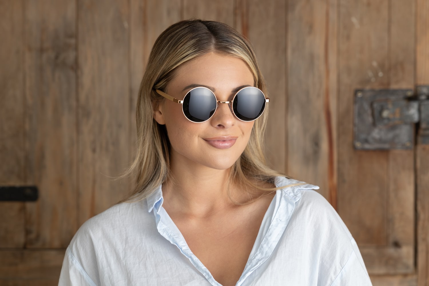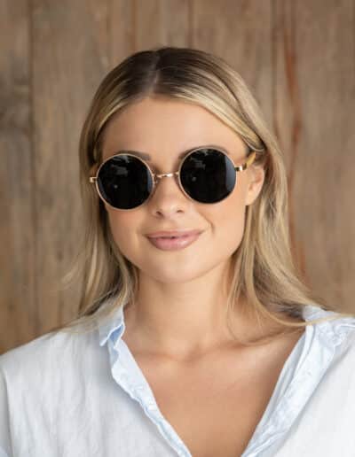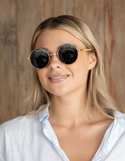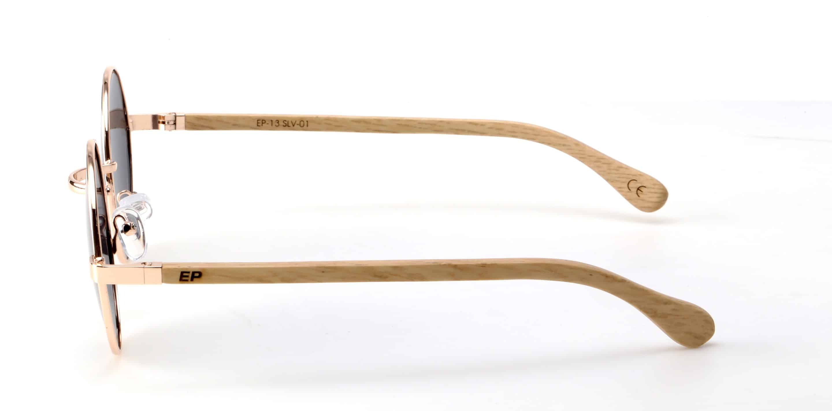 • 70s vibe rose gold round frame with grey polarised lens and Birch wood arms