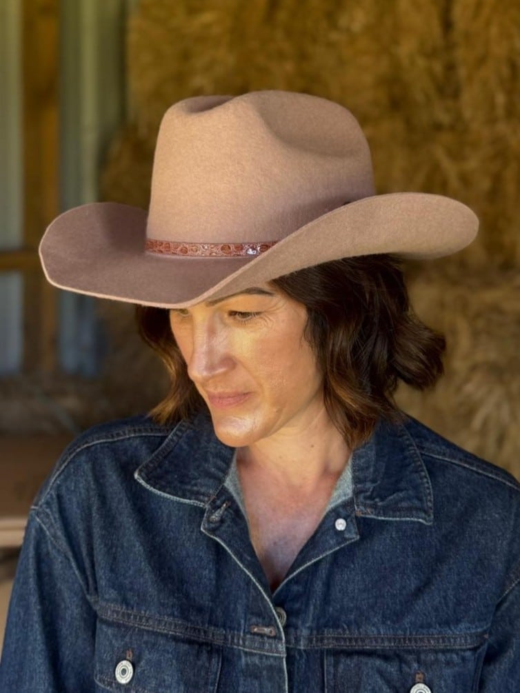 The Wild Rose Bold yet feminine, The Wild Rose is a pink cowboy hat crafted from soft, structured wool with a confident silhouette. The faux snakeskin belt adds a striking contrast—bringing a touch of edge to its romantic tone. Designed to stand out while still feeling effortless, this hat blends strength and softness. A statement piece for free spirits.